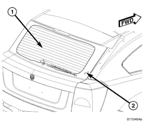 The rear window defogger system, also known as electric backlight (EBL), consists of two vertical bus bars and a series of grid lines (1) fired onto the inside surface of the rear window (2).