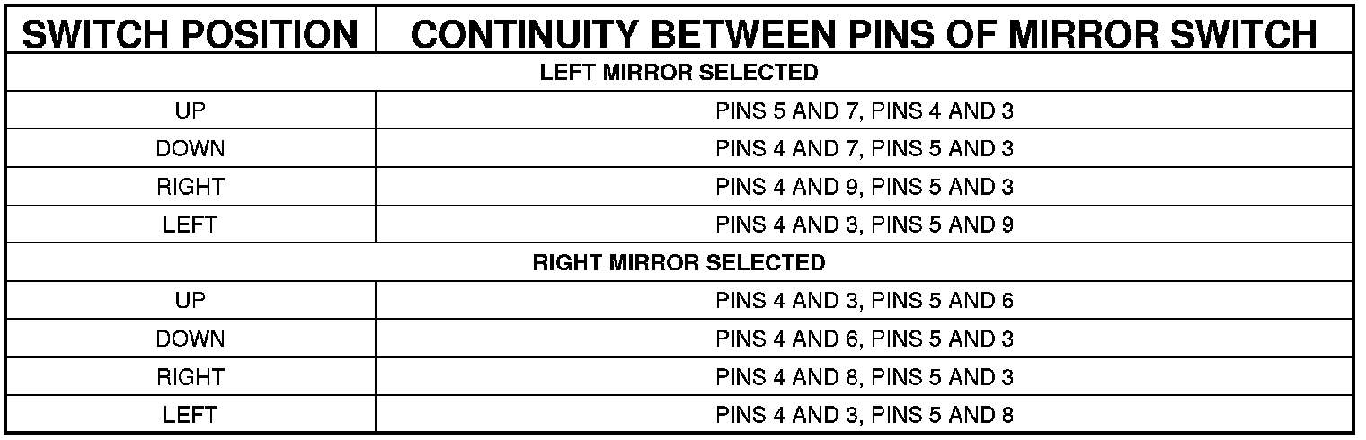 4. Test the switch continuity. Refer to the POWER MIRROR SWITCH TEST chart to determine if the continuity is correct for the switch in each switch position. If not OK, replace the inoperative switch as required.