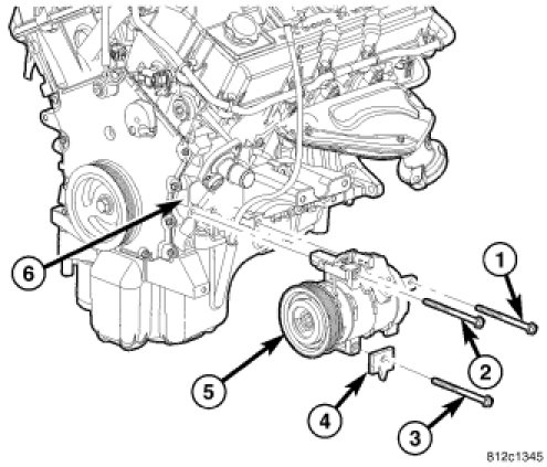 3. Loosely install the bolts (1 and 2) that secure the A/C compressor to the cylinder block.