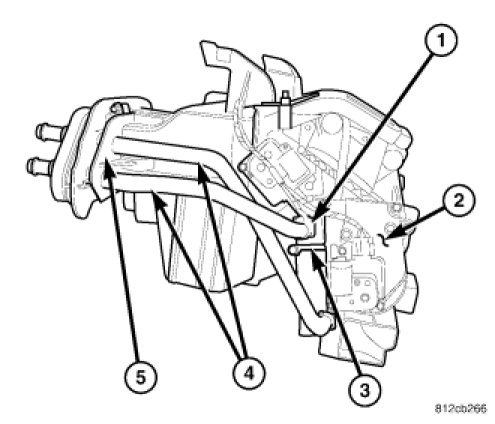 The heater core (1) is mounted into the driver side of HVAC air distribution housing (2), located behind the instrument panel. The heater core is a heat exchanger made of rows of tubes and fins and is secured to the air distribution housing by a plastic retaining bracket (3). The heater core tubes (4) are secured to the HVAC housing by a removable flange (5).