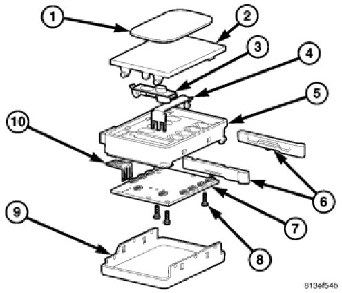 The rain sensor software is Flash compatible, which means it can be reprogrammed using Flash reprogramming procedures. However, if any of the hardware of the sensor is damaged or faulty, the entire rain sensor must be replaced. The rain sensor bracket (9) is serviced as a unit with the windshield glass. If the bracket is faulty, damaged, or separated from the windshield glass, the windshield must be replaced.