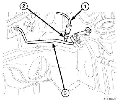 2. Install the A/C pressure transducer (2) onto the A/C liquid line (3). Tighten the A/C pressure transducer securely.