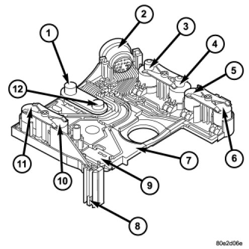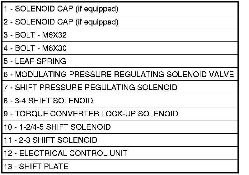 The electric valve control unit (7) consists of a plastic shell which houses the RPM sensors (1,12), regulating solenoid valves (3, 4), solenoid valves (5, 6, 10), the TCC solenoid valve (11), the park/neutral contact (9), and the transmission oil temperature sensor (8). Conductor tracks integrated into the shell connect the electric components to a plug connection (2). This 13-pin plug connection (2) establishes the connection to the vehicle-side cable harness and to the transmission control module (TCM). With the exception of the solenoid valves, all other electric components are fixed to the conductor tracks.