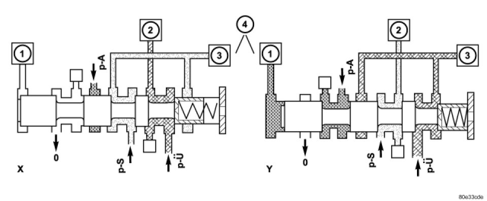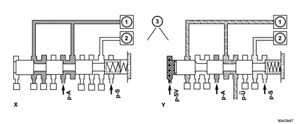 Each shift group possesses one shift pressure shift valve (4). The 1-2 / 4-5 and 2-3 shift pressure shift valves are installed in the shift valve housing; the 3-4 shift pressure shift valve is installed in the valve housing. It assigns the shift pressure (p-S) to the activating actuator and the overlap pressure (p-U) regulated by the overlap regulating valve to the deactivating actuator.