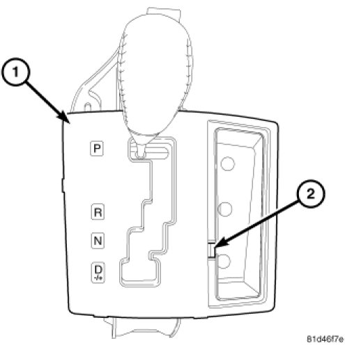 3. Depress the BTSI override (2) on the side of the shifter assembly (1).