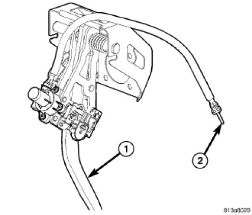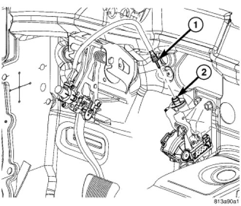 1. Disconnect the adjuster cable (1) running between the accelerator pedal module and the brake pedal assembly at the adjuster motor (2).