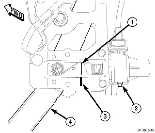 4. Rotate the adjuster cable strand until the brake pedal (4) gear drive block (1) lines up with the full-forward adjustment line (3) as shown. If equipped, fine adjustments can be made by turning the adjustment knob (2) by hand to line up the components.
