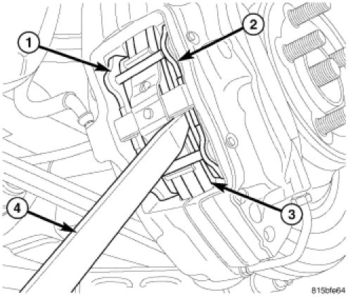 33. For each parking brake cable, place 13 mm 12-point box wrench (4) over cable strand and completely onto cable retainer (3) as shown at crossmember bracket (1 - left)(2 - right). It may be necessary to wiggle wrench around somewhat to collapse retainer fingers. With wrench in place, pull cable from bracket.