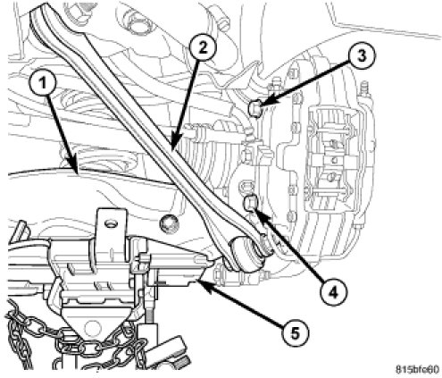 14. If equipped with SRT8 disc brakes, on each rear disc brake, support spring link (1) using a transmission jack (5) or other appropriate jack. Raise spring link just enough to access brake caliper lower mounting bolt (4) from above compression link (2).