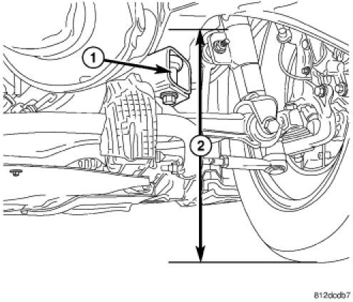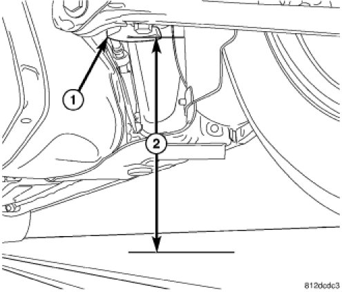 2. Rear - On each side of the vehicle, measure the distance (2) from the travel limiter (1) attached to the front rear crossmember mount bushing to the floor or alignment rack/lift runway surface. It may be necessary to measure to the bottom of a straight edge, placed from lift runway to runway, to get an accurate measurement.