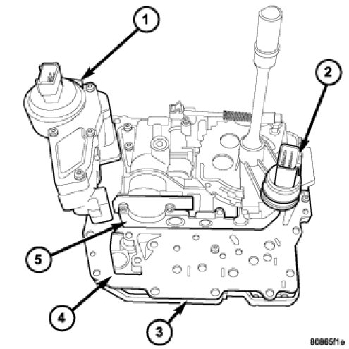 The Transmission Range Sensor (TRS) (2) is mounted to the top of the valve body inside the transmission and can only be serviced by removing the valve body assembly. The electrical connector extends through the transmission case.
