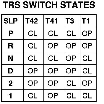 The Transmission Range Sensor (TRS) communicates shift lever position (SLP) to the TCM as a combination of open and closed switches. Each shift lever position has an assigned combination of switch states (open/closed) that the TCM receives from four sense circuits. The TCM interprets this information and determines the appropriate transmission gear position and shift schedule.