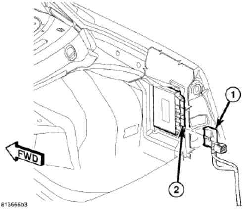 2. Position the Park Assist Module (2) and install the two attaching screws (1). Torque screws to 3.5 Nm (30 in. lbs.).