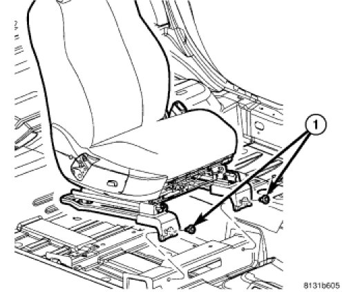 NOTE: If the vehicle is equipped with a power front passenger seat, to remove the adjuster from the riser it is necessary to have battery power to move the seat forward and rearward to access the mounting bolts.