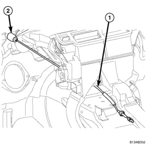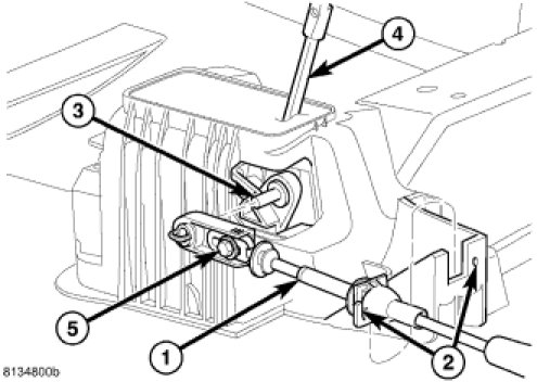 1. From under the hood, route the gearshift cable (1) through the dash panel and toward the shifter assembly.