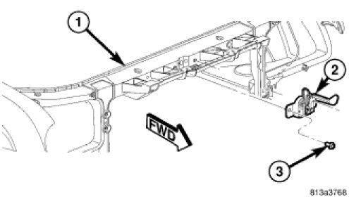 7. Loosely install the two bolts (3) that secure the hood latch to the headlamp mounting crossmember.