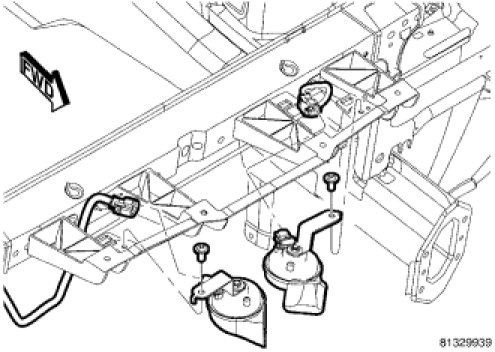 9. Install the horns onto the headlamp mounting crossmember. Tighten the bolts to 28 Nm (21 ft. lbs. ).