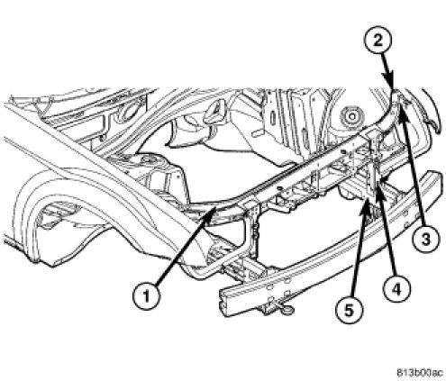 3. Loosely install the bolts (4) that secure the headlamp mounting crossmember to the front frame rails (5).