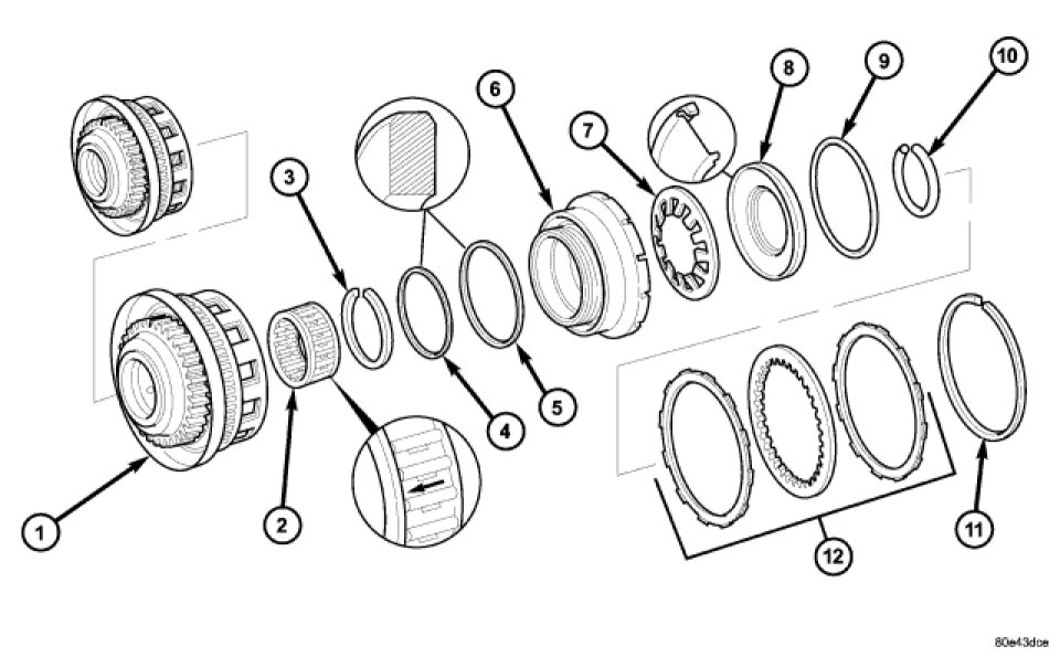 2. Take multiple-disc pack (12) out of outer multiple-disc carrier (1). Note which clutch disc is removed just prior to the spring plate (8) for re-assembly. If the clutch discs are re-used, this disc must be returned to its original position on top of the spring plate.