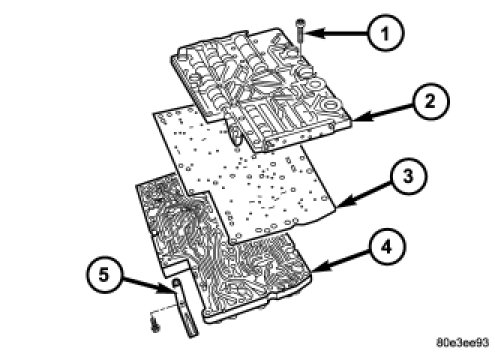 9. Lubricate and install 3-4 Holding Pressure Shift Valve assembly (2), 3-4 Command Valve assembly (3), 3-4 Shift Pressure assembly (4) and the 3-4 Overlap Regulating Valve Sleeve and Piston assembly (5) into the valve body.