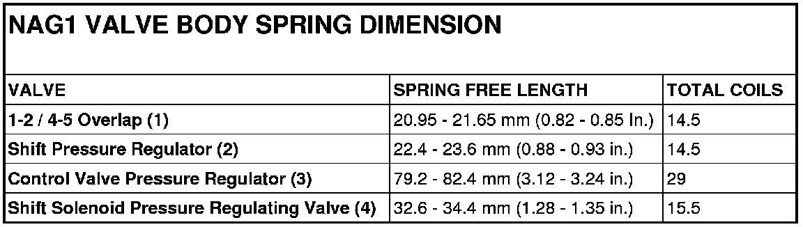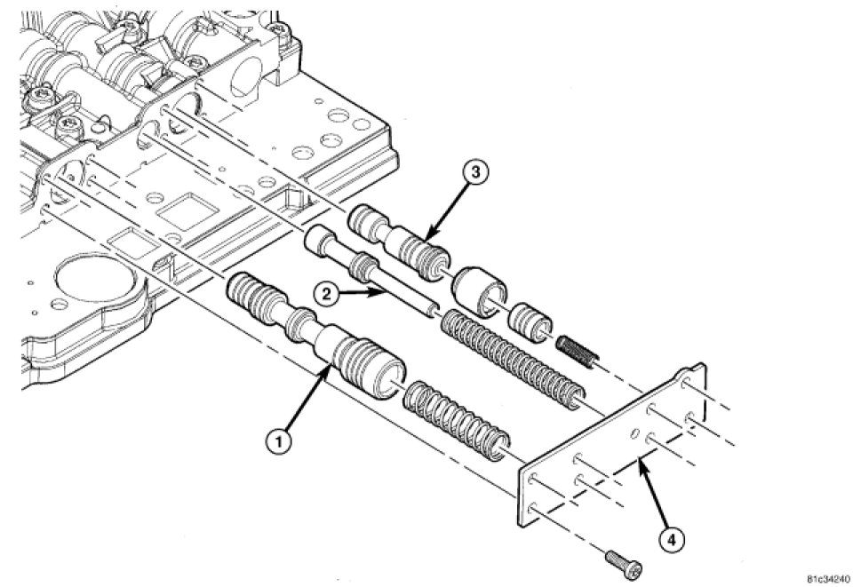 4. Lubricate and install the 1-2 / 4-5 Overlap Regulating Valve, Sleeve, and Piston assembly (1), Shift Pressure Regulating Valve assembly (2), Control Valve Pressure Regulator Valve assembly (3) and Shift Solenoid Pressure Regulating Valve assembly (4) into the valve body.
