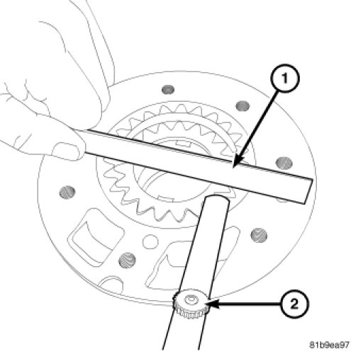Side clearance is the difference between the thickness of the pump gears and the depth of the pocket in the pump housing. Side clearance can be measured by laying a flat plate (1) across the mounting face of the pump housing, and measuring the distance between the plate and the gears with a feeler gauge (2).
