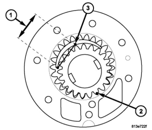 Tip clearance for the inner gear can be checked by moving the inner gear into tight mesh (2) with the outer gear as shown. Clearance between the ID of the crescent feature of the housing and the OD of the teeth of the inner gear (3) should then me measured at a point 37 mm (1.45 in.) from the corner of the crescent (1) feature, as shown below.