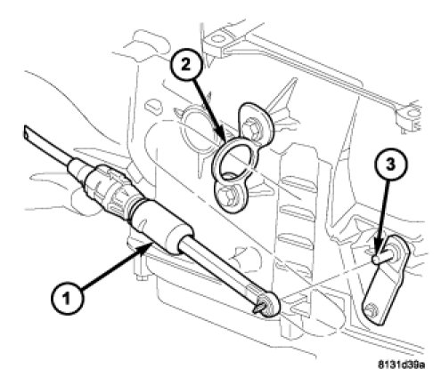 6. From under the hood, route the gearshift cable (1) forward of the air conditioning lines and the heater hoses (2) and toward the transmission (3) manual lever.