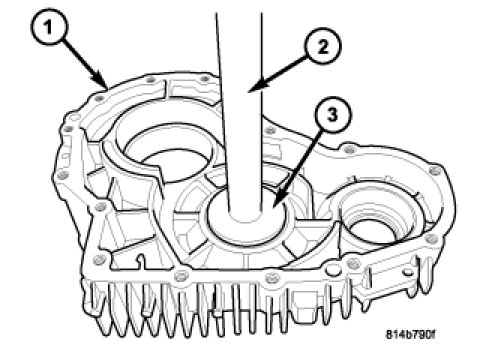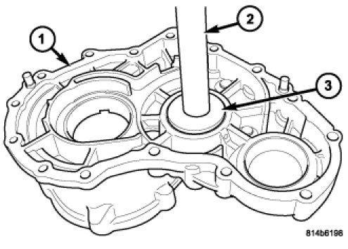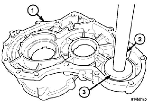 6. Install the front output shaft rear bearing race into the rear housing (1) with Handle C-4171 (2) and Installer D-130 (3).