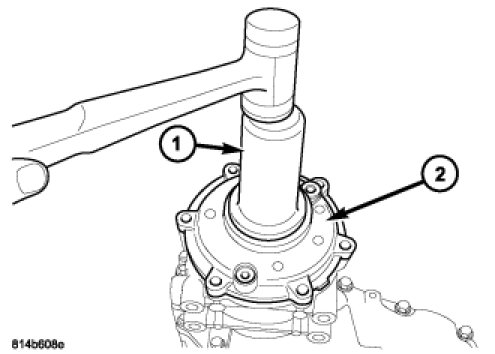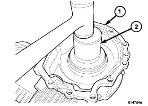 34. Install the rear output shaft seal from the transfer case cover (2) with Installer C-3860A (1).