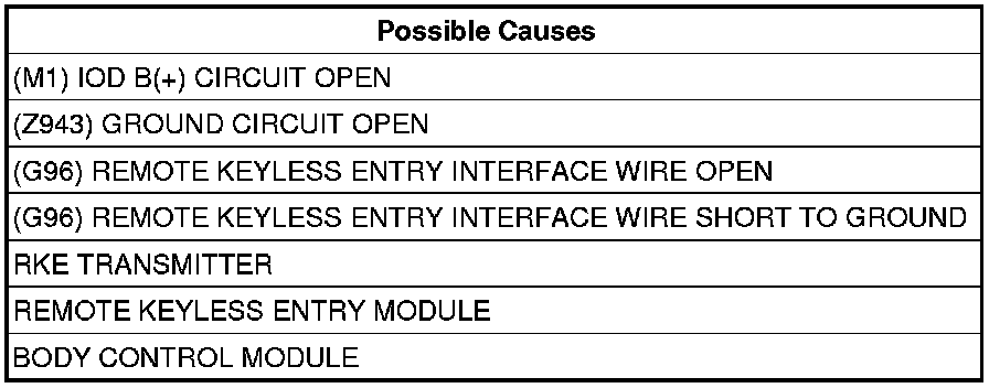 - Repair the (G96) Remote Keyless Entry Interface wire for a short to ground.