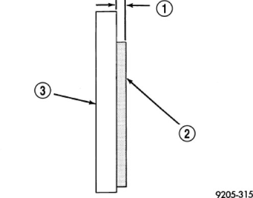The minimum front brake pad assembly friction material thickness (1) is 2.5 mm (.100 in.). When the brake pad friction material reaches the minimum thickness, the front brake pads must be replaced.