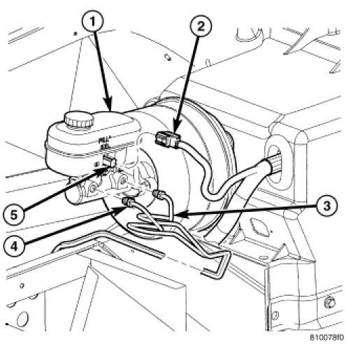 1. Align brake fluid level switch (5) with mounting hole on left side of master cylinder (1) brake fluid reservoir. Push switch into mounting hole until switch retaining tabs are expanded on opposite side of reservoir, locking it in place.