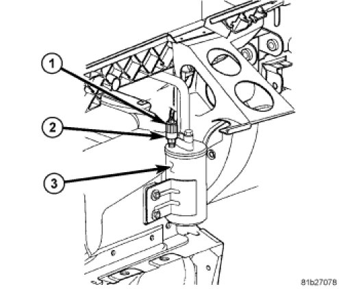 5. Disconnect the wire harness connector (1) from the A/C low pressure switch (2) located on the top of the A/C accumulator (3).