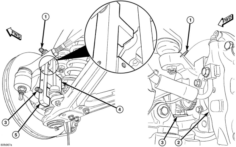 CAUTION: Prior to any cam bolt rotation, cam bolt lock nuts must be loosened, allowing lower control arm mounting brackets to spread, thus allowing free movement of control arm bushings. If not performed, serious bracket bending, weld breakage of cam retainer, free cam and cam bolt shank fracturing, or thread damage can occur. It may be necessary to tap bracket ears away from bushings to allow unrestricted cam bolt movement.