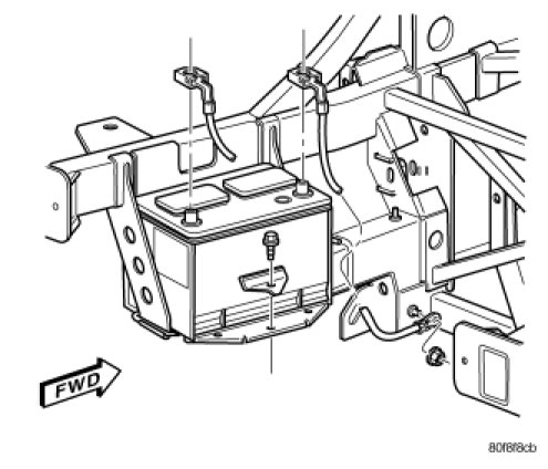 4. Install the battery hold down and bolt. Tighten to 28 Nm (21 ft. lbs).