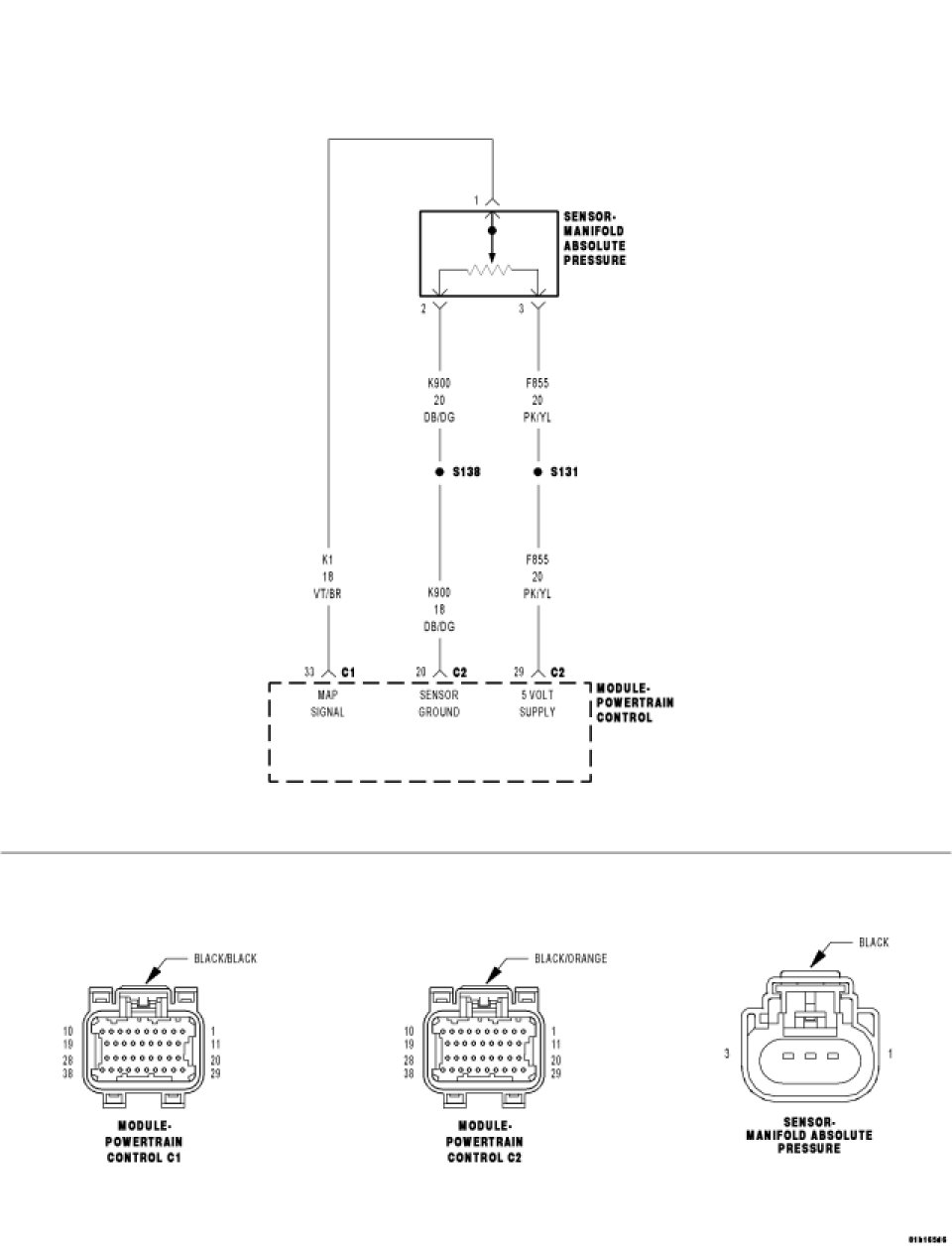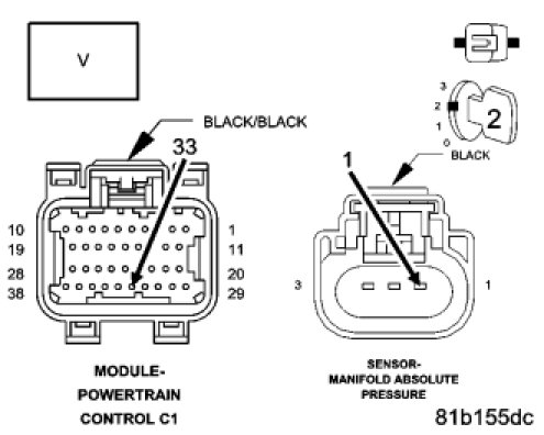 Using the wiring diagram/schematic as a guide, inspect the wiring and connectors between the MAP Sensor and the Powertrain Control Module (PCM).