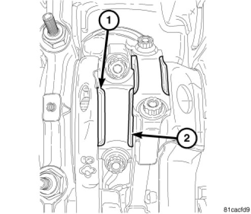 CAUTION: Verify correct rod installation or engine damage could result. The large cut out (1) in the rod must face the crankshaft. The small cut out (2) must face the other rod.