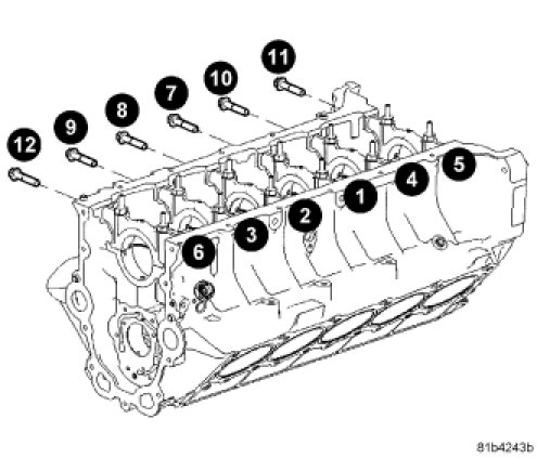 Install cylinder head(s) over dowel pins. Install new cylinder head bolts 1-12. Tighten cylinder head bolts 1-12 in the sequence shown in using a three step tightening sequence: