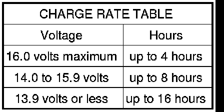 3. Battery chargers vary in the amount of voltage and current they provide. The amount of time required for a battery to accept measurable charging current at various voltages is shown in the Charge Rate Table. If the charging current is still not measurable at the end of the charging time, the battery is faulty and must be replaced. If the charging current is measurable during the charging time, the battery may be good and the charging should be completed in the normal manner.