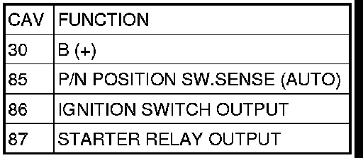 3. The relay normally open terminal (87) is connected to the common feed terminal (30) in the energized position. This terminal supplies battery voltage to the starter solenoid field coils. There should be continuity between the cavity for relay terminal 87 and the starter solenoid terminal at all times. If OK, go to STEP 4. If not OK, repair the open circuit to the starter solenoid as required.