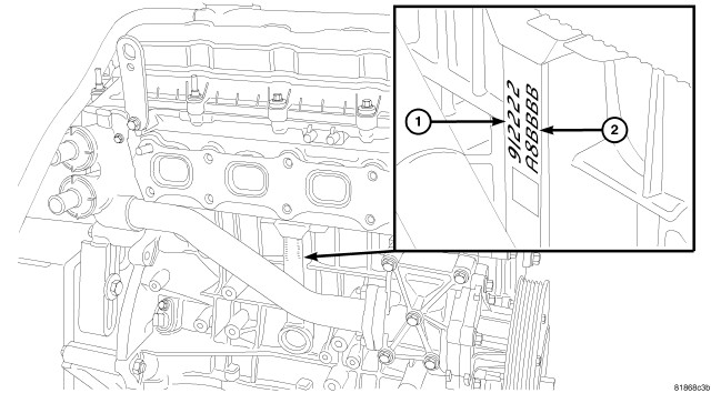 The pistons are select fit to each bore. There are three different grades of pistons available; A, B, and C. The piston identification (2) is located in the middle of the block on the right side of the engine. The bore identification starts at the top and reads downward. Bore #1 is at the top and bore #4 is at the bottom.