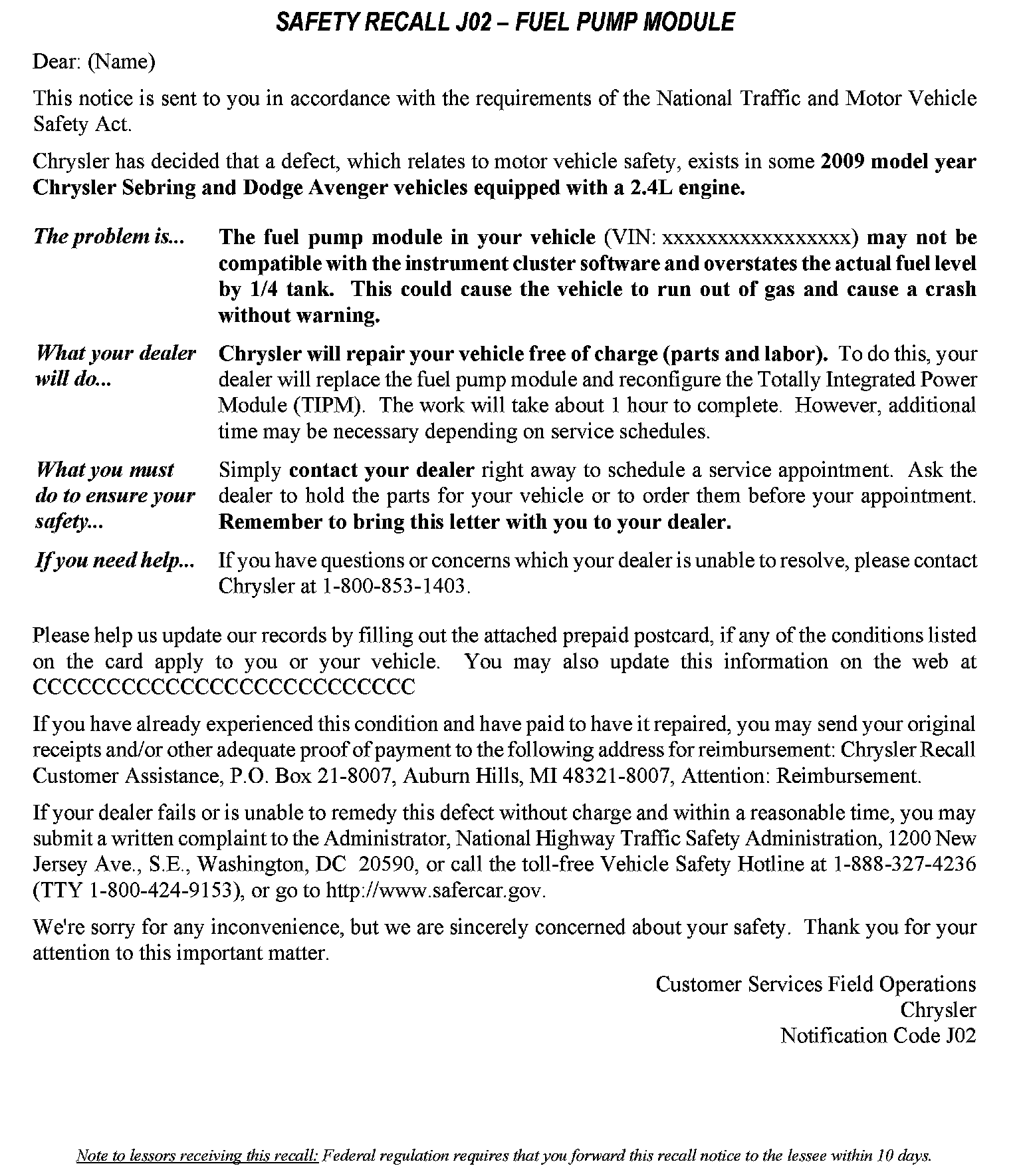 Recall - Fuel Pump Module Replacement