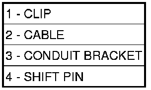 6. Connect cable (2) to shifter conduit bracket (3) and shift pin (4). Install cable retaining clip (1).