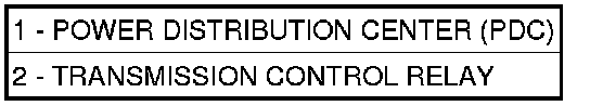 The transmission control relay (2) is located in the Power Distribution Center (PDC) (1), which is located on the left side of the engine compartment.