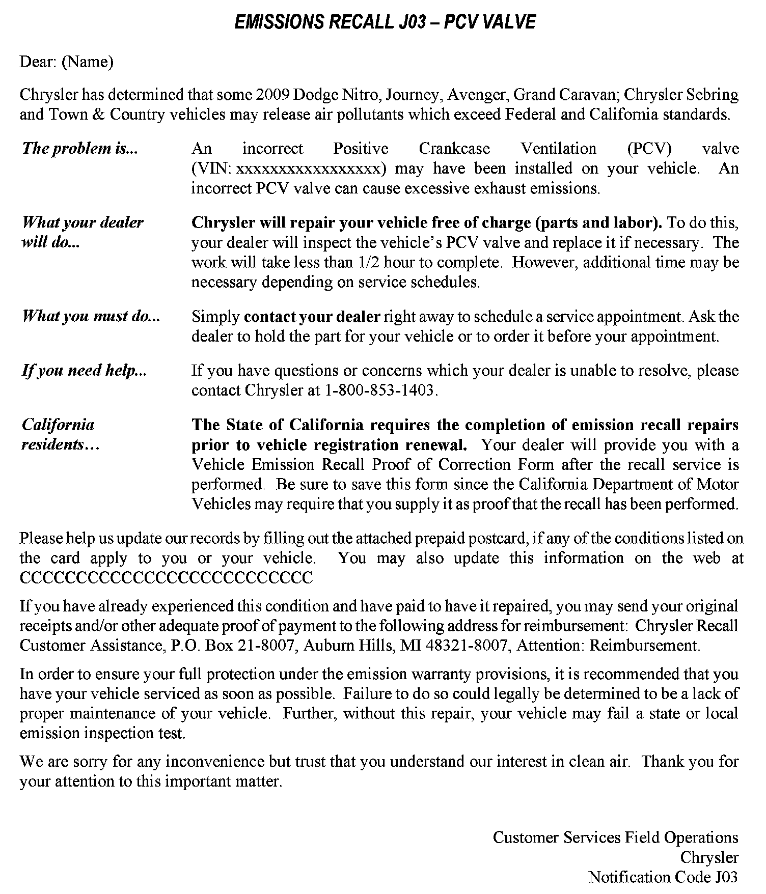 Recall - PCV Valve Inspection/Replacement