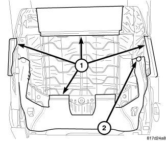 9. Install the push pins (1) and connect the inner cover to the hooks (2).