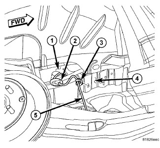 7. Insert the wheel speed sensor cable (5) through the hole in the body (1) and install the grommet (2) in the hole.