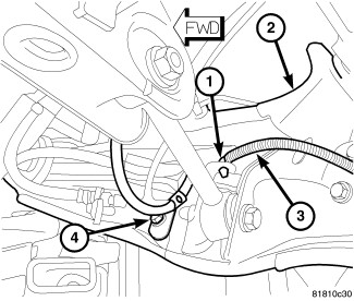 3. Position the wheel speed sensor (3) on the trailing link (2) and install the screw (4) securing it in place. Tighten the mounting screw to 18 Nm (13 ft. lbs.).