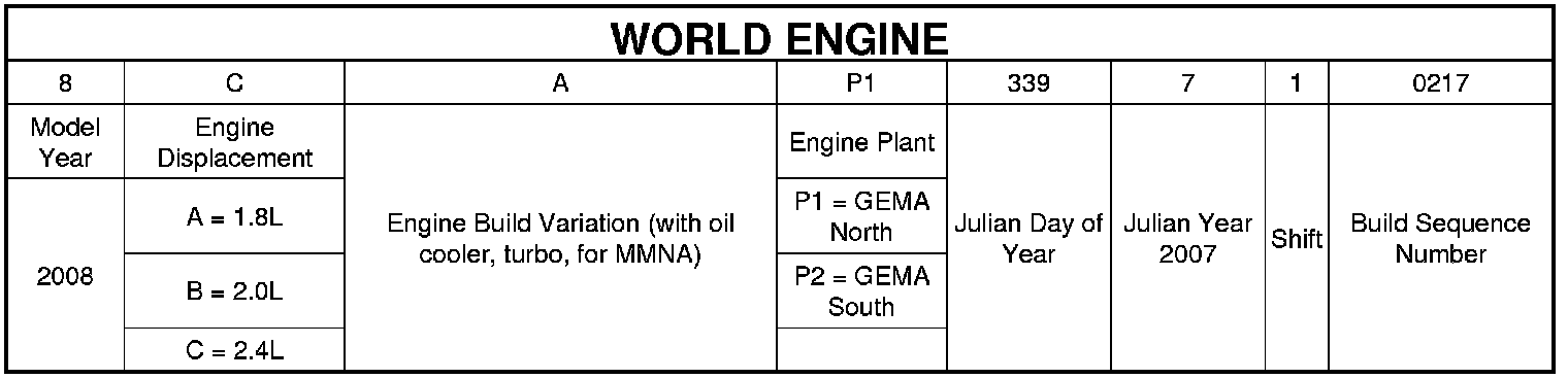 and the bellhousing. The serial number contains engine build date, build information, displacement, and build sequence number
